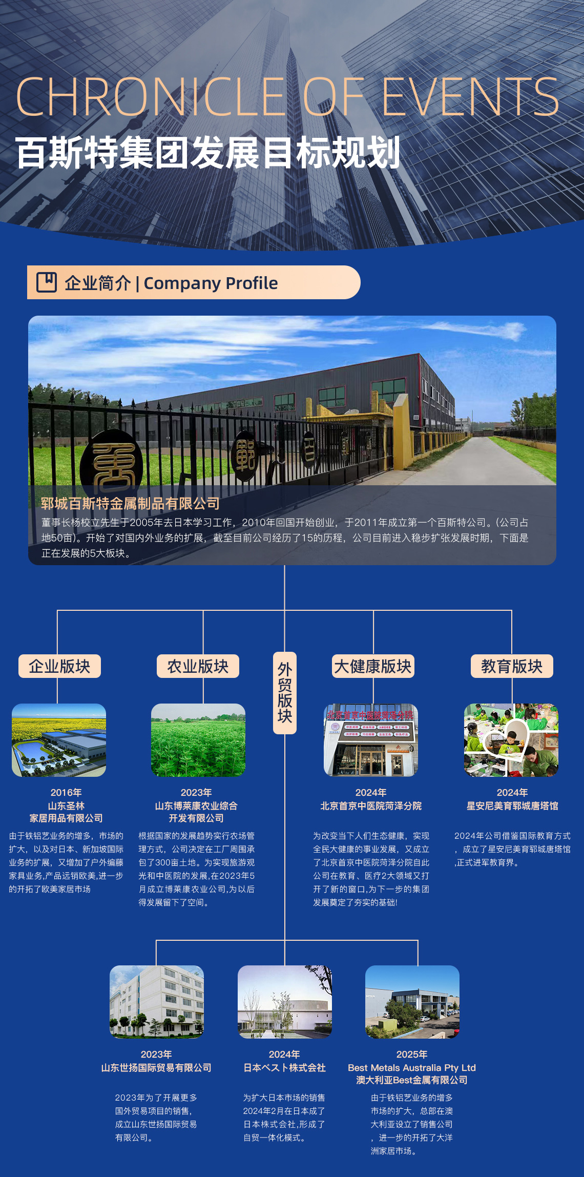 鄆城百斯特金屬制品有限公司位于山東鄆城,東接京九鐵路,南接日東、濟(jì)廣高速,交通便利。公司占地30000平方米,是專業(yè)生產(chǎn)和銷售鐵藝制品、鋁藝制品、不銹鋼制品、藤鐵家具、鋼木家具、農(nóng)業(yè)設(shè)備等綜合性企業(yè),擁有雄厚的技術(shù)力量,先進(jìn)的生產(chǎn)設(shè)備,專業(yè)的研發(fā)隊(duì)伍,并建立嚴(yán)謹(jǐn)?shù)墓芾碇贫?,形成了富有特色的企業(yè)文化。...